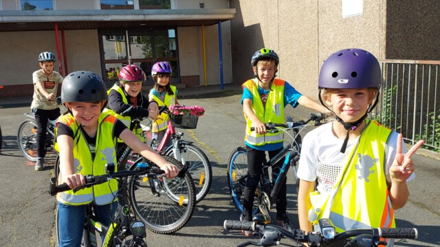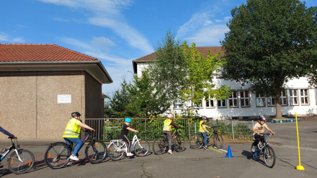 Zurzeit üben wir für die Radfahrprüfung. Hier seht ihr den Fahrradparcours, der auf dem Schulhof für uns aufgebaut wurde. Von Runde zu Runde wurden wir immer sicherer. Wir haben uns gegenseitig Mut gemacht und hatten viel Spaß dabei!